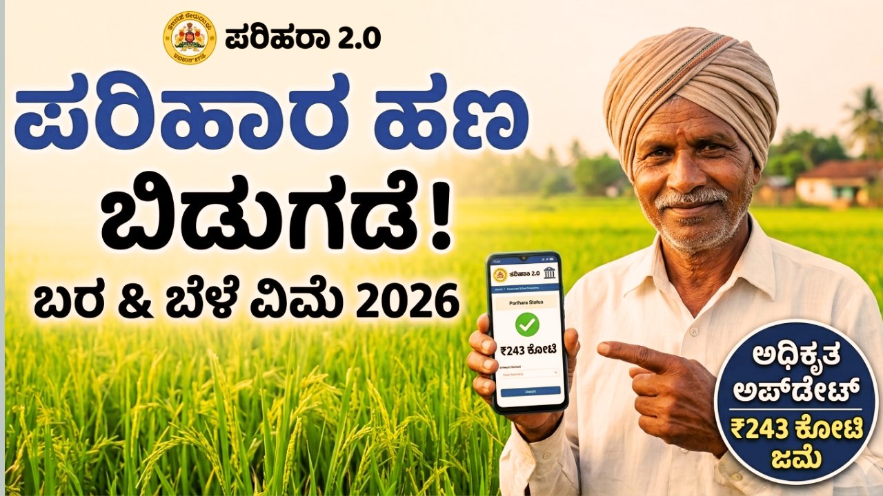 ಬರ ಪರಿಹಾರ ಮತ್ತು ಬೆಳೆ ವಿಮೆ 2026 : ಕರ್ನಾಟಕ ಸರ್ಕಾರದ ಈ ಬೆಳೆ ವಿಮೆ ಮತ್ತು ಬೆಳೆ ಹಾನಿ ಪರಿಹಾರವು ರೈತರಿಗೆ ಸಂಕಷ್ಟದ ಸಮಯದಲ್ಲಿ ಆರ್ಥಿಕ ಚೈತನ್ಯ ನೀಡಲಿದೆ. ಈಗಾಗಲೇ ರೂ. 243 ಕೋಟಿ ಹಣ ಬಿಡುಗಡೆಯಾಗಿದ್ದು, ಇನ್ನುಳಿದ ರೈತರಿಗೂ ಹಂತ-ಹಂತವಾಗಿ ಹಣ ಜಮೆಯಾಗುತ್ತಿದೆ. ಈ ಲೇಖನದಲ್ಲಿ ನೀಡಲಾದ ಲಿಂಕ್ಗಳ ಮೂಲಕ ನಿಮ್ಮ ಹೆಸರನ್ನು ಈಗಲೇ ಚೆಕ್ ಮಾಡಿಕೊಳ್ಳಿ. ಈ ಮಾಹಿತಿ ಇಷ್ಟವಾದರೆ ನಿಮ್ಮ ಊರಿನ ವಾಟ್ಸಾಪ್ ಗ್ರೂಪ್ಗಳಲ್ಲಿ ಹಂಚಿಕೊಳ್ಳುವ ಮೂಲಕ ಇತರ ರೈತ ಬಾಂಧವರಿಗೂ ಈ ಉಪಯುಕ್ತ ಮಾಹಿತಿಯನ್ನು ತಲುಪಿಸಿ.